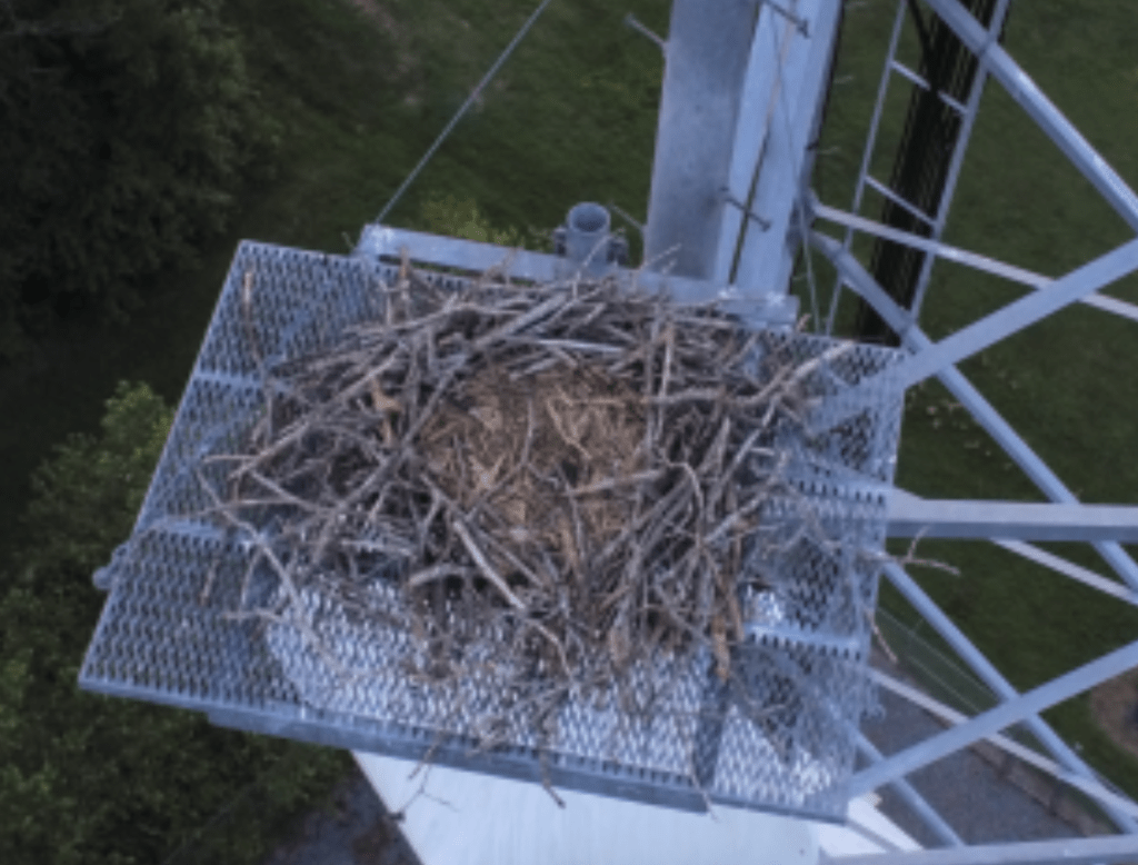 This tower has a large bird nest built up on a maintenance platform. Not only does this represent a hazard to the climbers (mother birds can be angry!), it also prevents the climber from accessing the workspace to perform his duties. This means lost time, and lost money. Photo taken near Leonardtown, MD.