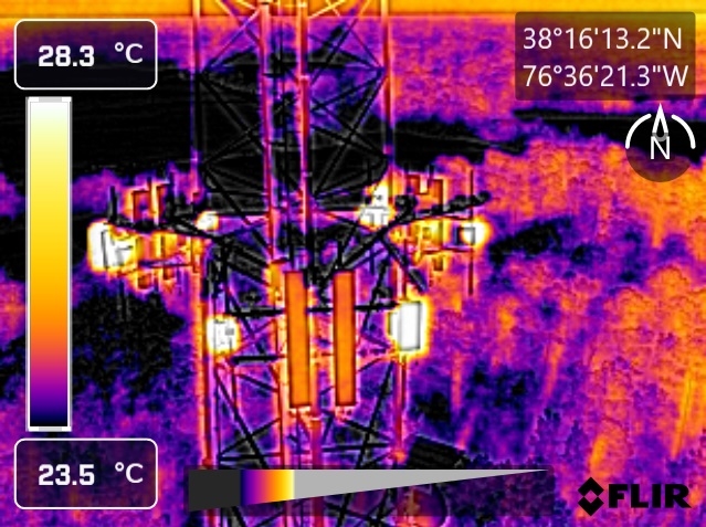 Drones can check the general condition of the tower with a basic visual scan. This can identify hazards to climbers and maintenance issues, resulting in lower risk and time saved for the climbing team. Photo taken near Leonardtown, MD.